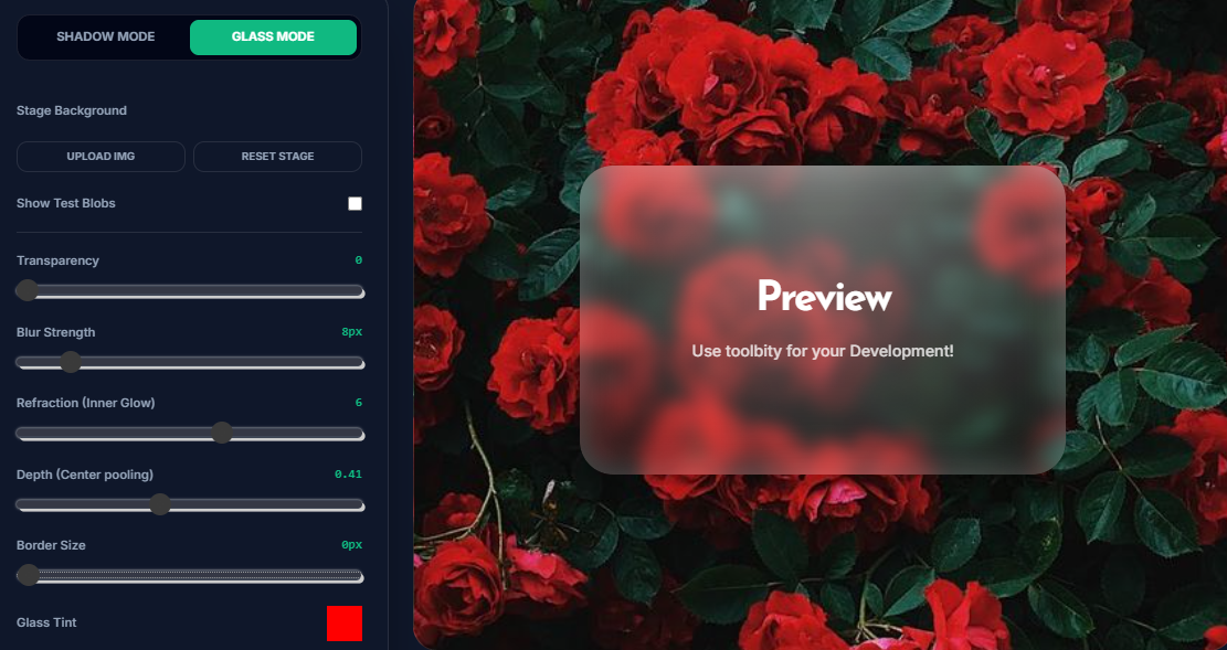 An interactive Glassmorphism Generator to design sleek, frosted-glass CSS effects with real-time controls for transparency, blur, refraction, and depth.